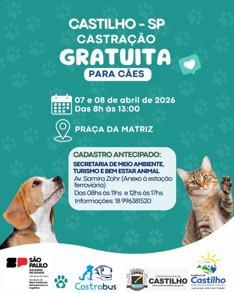 Diferente de Ilha Solteira, a etapa castilhense será voltada exclusivamente para a castração de cães. O agendamento prévio já está sendo coordenado pela Secretaria Municipal de Meio Ambiente, Turismo e Bem-Estar Animal.