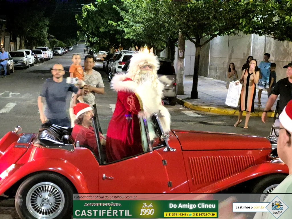 Quando o bom velhinho surgiu, caminhando entre as famílias, vestido com seu tradicional traje vermelho, a praça vibrou. Ele acenava devagar, olhando nos olhos das crianças, sorrindo, tocando as mãos estendidas pelo caminho. #Natal Acolhedor em Castilho SP