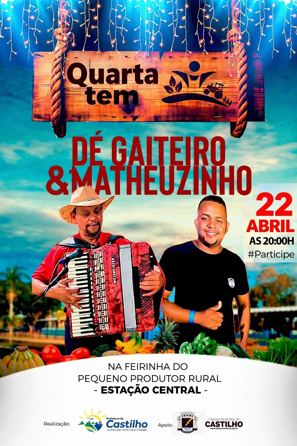 Nesta quarta-feira, 22 de abril, a Feirinha do Pequeno Produtor Rural, localizada na Estação Central de Castilho, recebe a apresentação de Dé Gaiteiro e Matheuzinho, a partir das 20h.